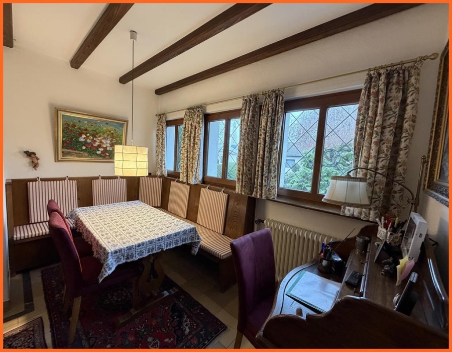 Herzstück des Hauses ist das helle 50 m² große Wohnzimmer mit seinem stilvollen Kaminofen. Die großen Fensterfronten ermöglichen einen herrlichen freien Blick in den eindrucksvollen Garten, wobei das eingewachsene Grundstück einen fast vollständigen Sichtschutz bietet.