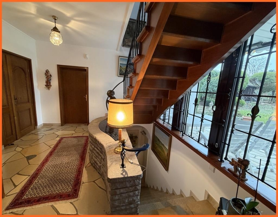 Der imposante Flurbereich mit seinen liebevollen Details und den bleiverglasten Fenstern zeugt vom außergewöhnlich gutem Geschmack des Besitzers. Eine stilvolle Treppe führt in das Obergeschoss. Dort befinden sich 5 Schlafräume und 2 Bäder.