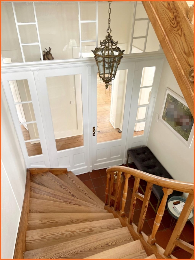 Die Villa hat ihren ursprünglichen Zustand weitgehend erhalten. Dazu gehören der Parkettboden aus amerikanischem Pinienholz, die eleganten Schiebetüren in der Beletage, das großzügige Treppenhaus, sowie die eleganten Fenster. Das Haus ist innen und außen in einem einwandfreien Zustand.