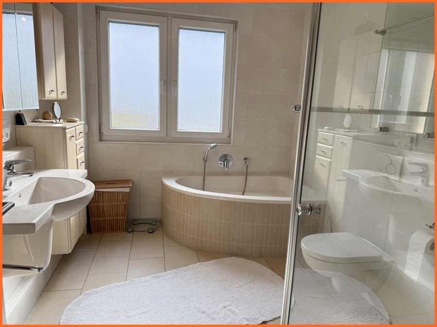 Desweiteren erwarten Sie ein Schlafzimmer mit Rückzugsgarantie, 2 Zimmer für Arbeiten, Gäste oder Kinder, flexibel nutzbar, Tageslichtbad mit Wanne und Dusche, Diele und zusätzliches Gäste-WC. Die Wohnung ist barrierefrei zu erreichen. Die besondere Lage im Kurgebiet wird Sie begeistern und Ihnen eine Entscheidung leicht machen.